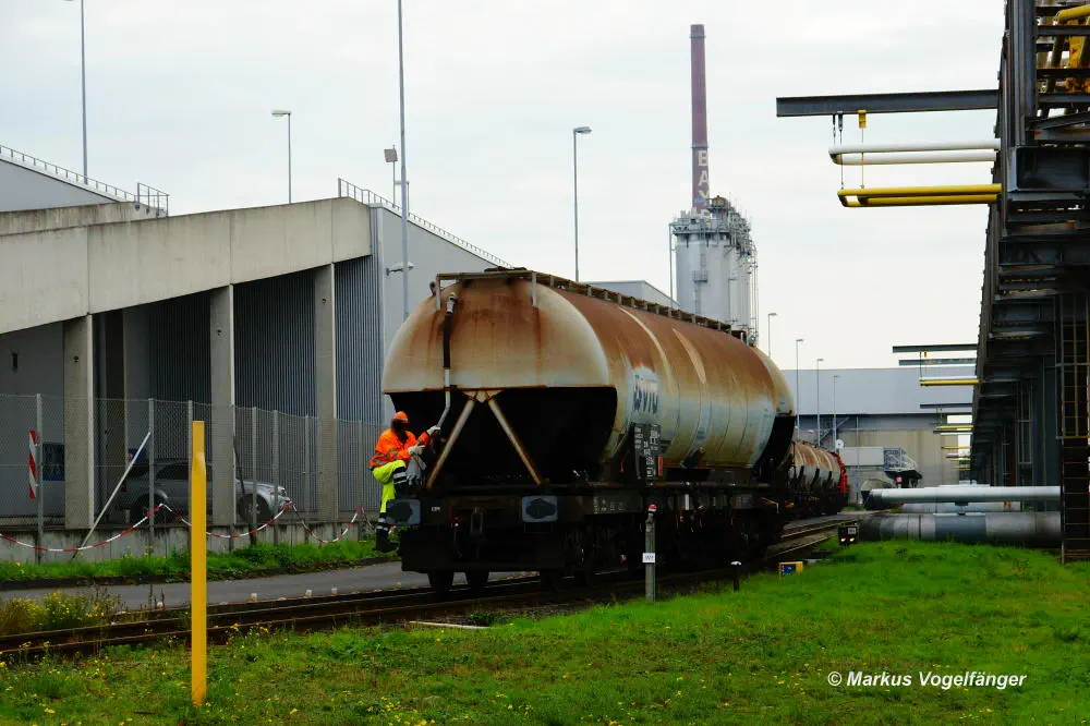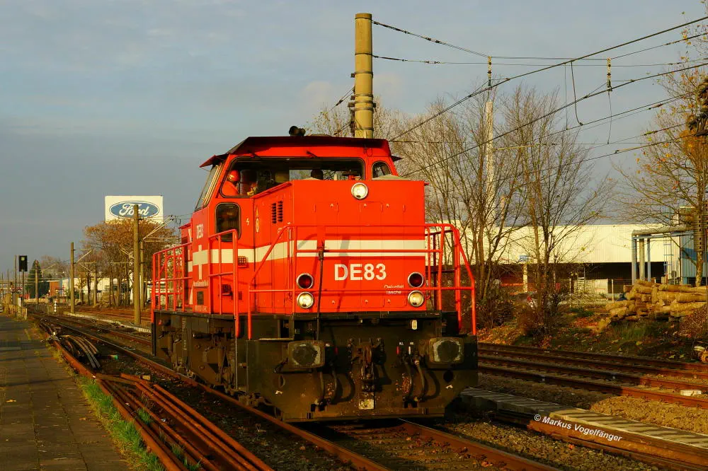 Ein Güterzug auf der Emdener Straße zwischen den Haltestellen Fordwerke Mitte und Fordwerke Nord am 19.10.2013. Im Vordergrund sind die zu erneuernden Streckengleise der Linie 12 zu sehen.
