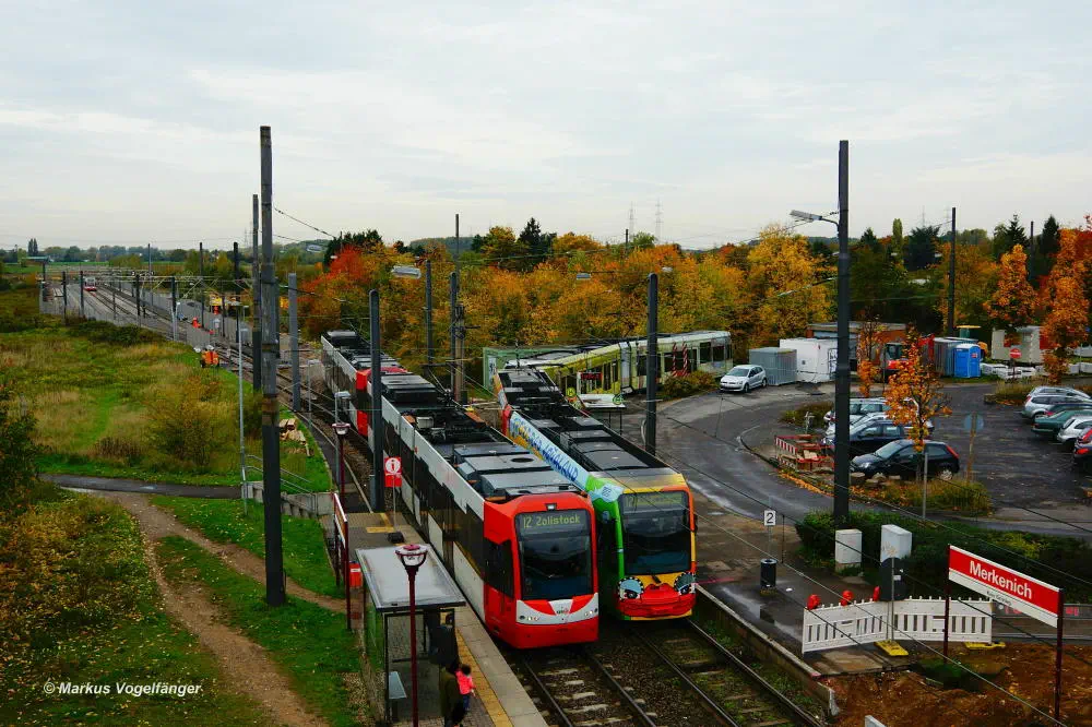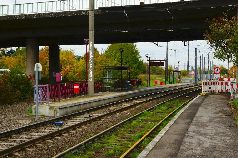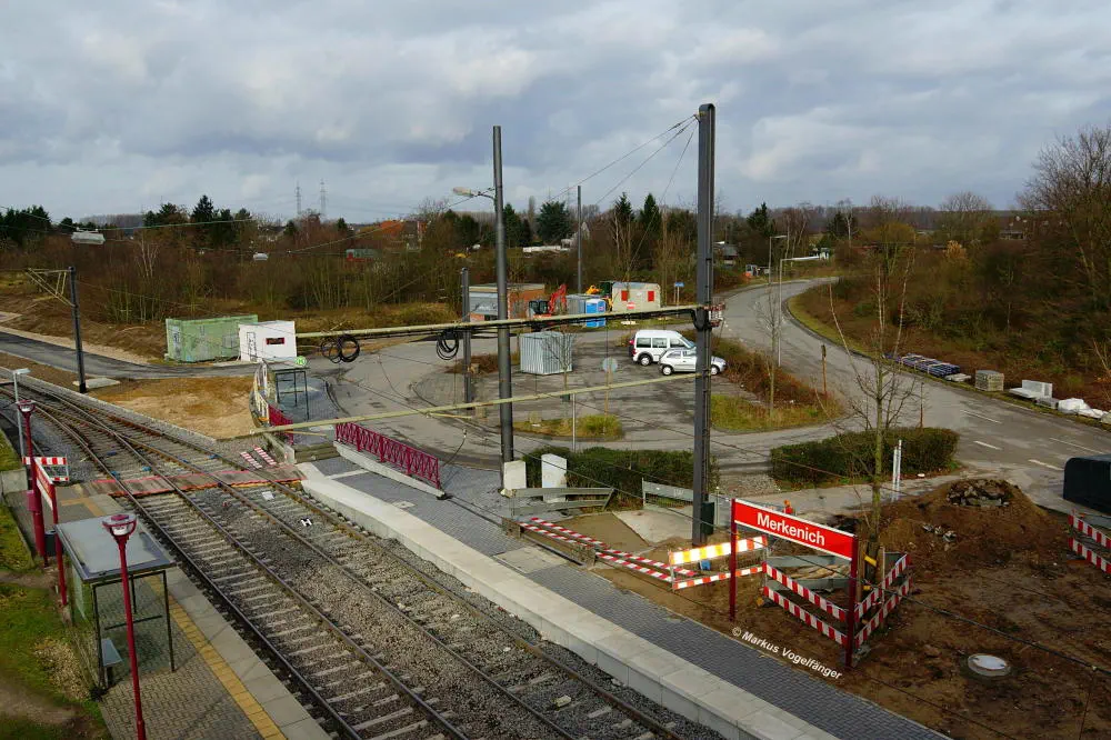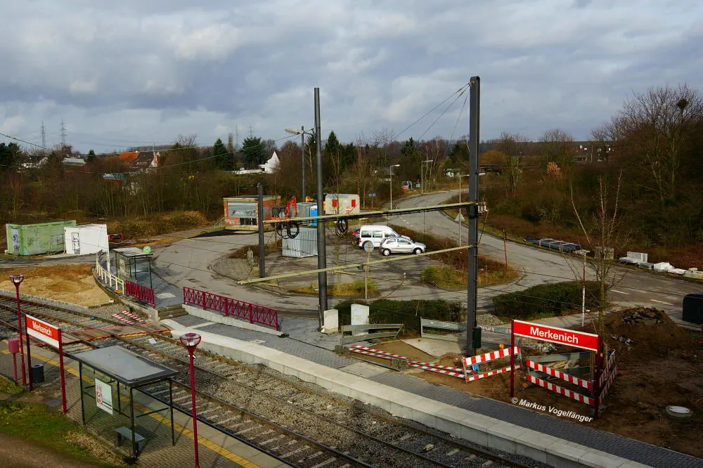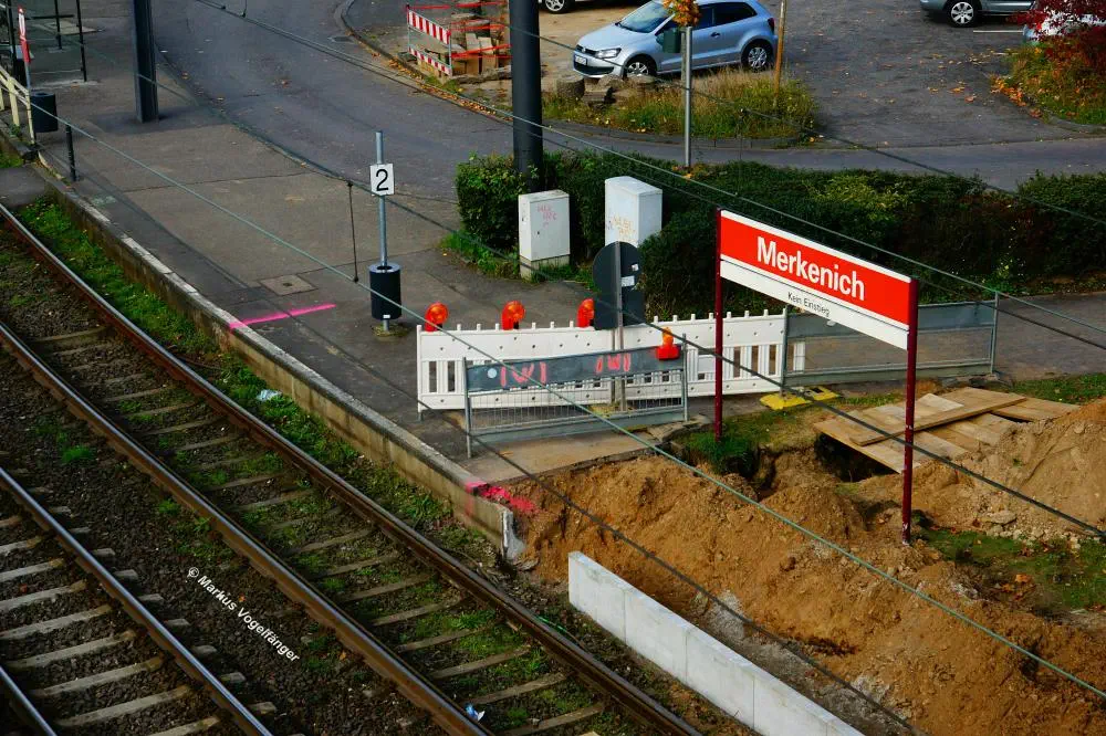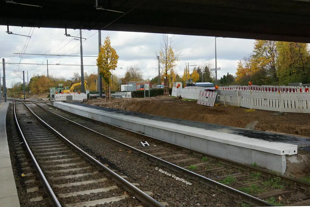Die Ankunftsbahnsteig Merkenich (im Hintergrund) am 18.10.2013. Er wurde provisorisch um einige Meter Richtung Merkenich Mitte verlegt.