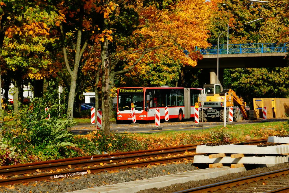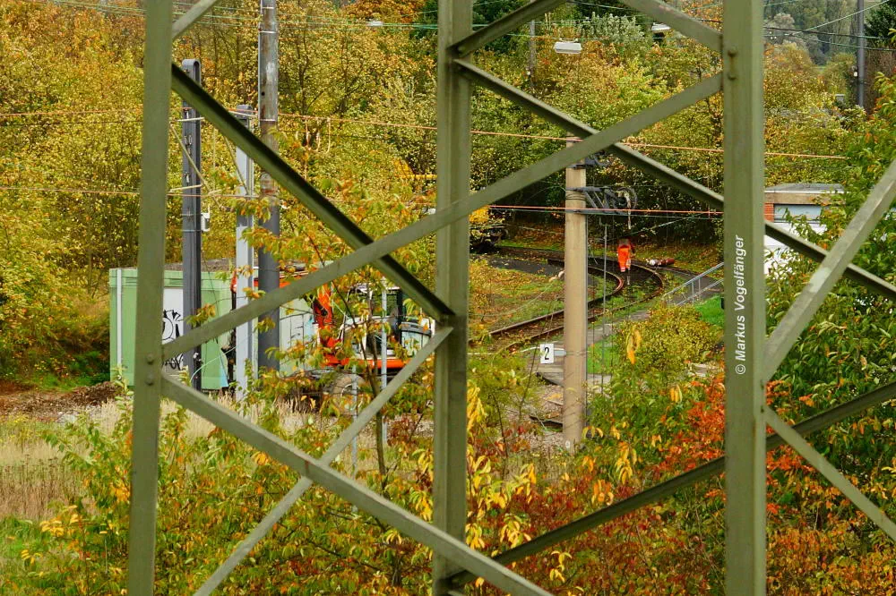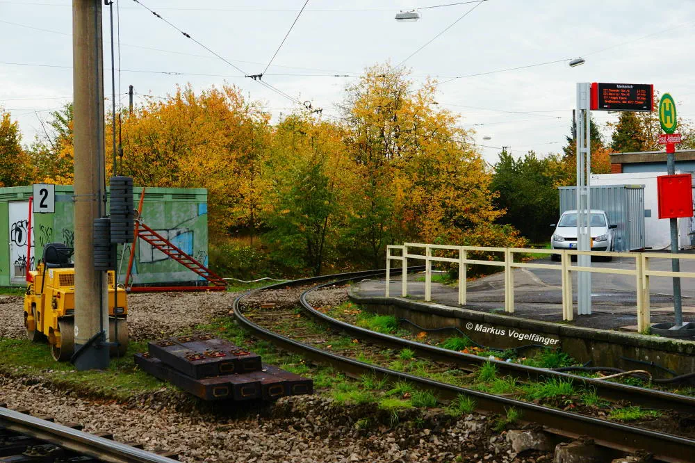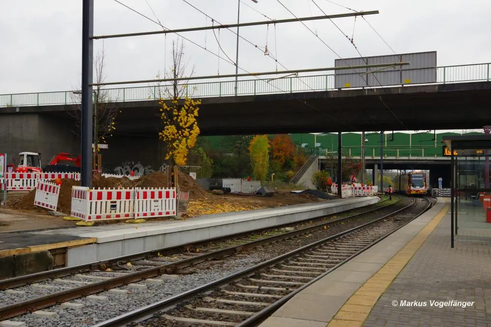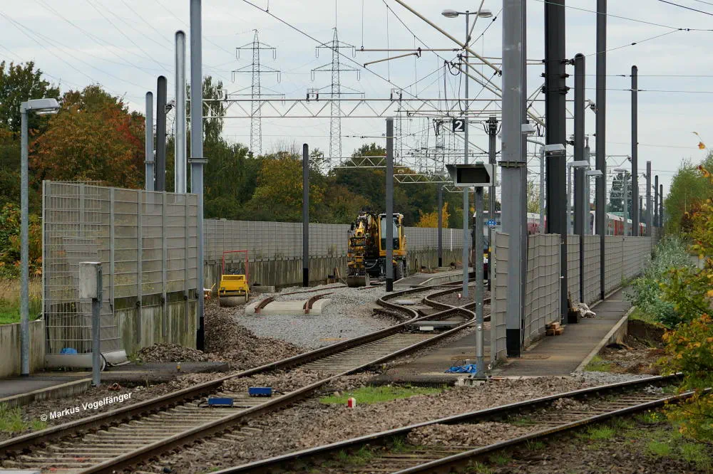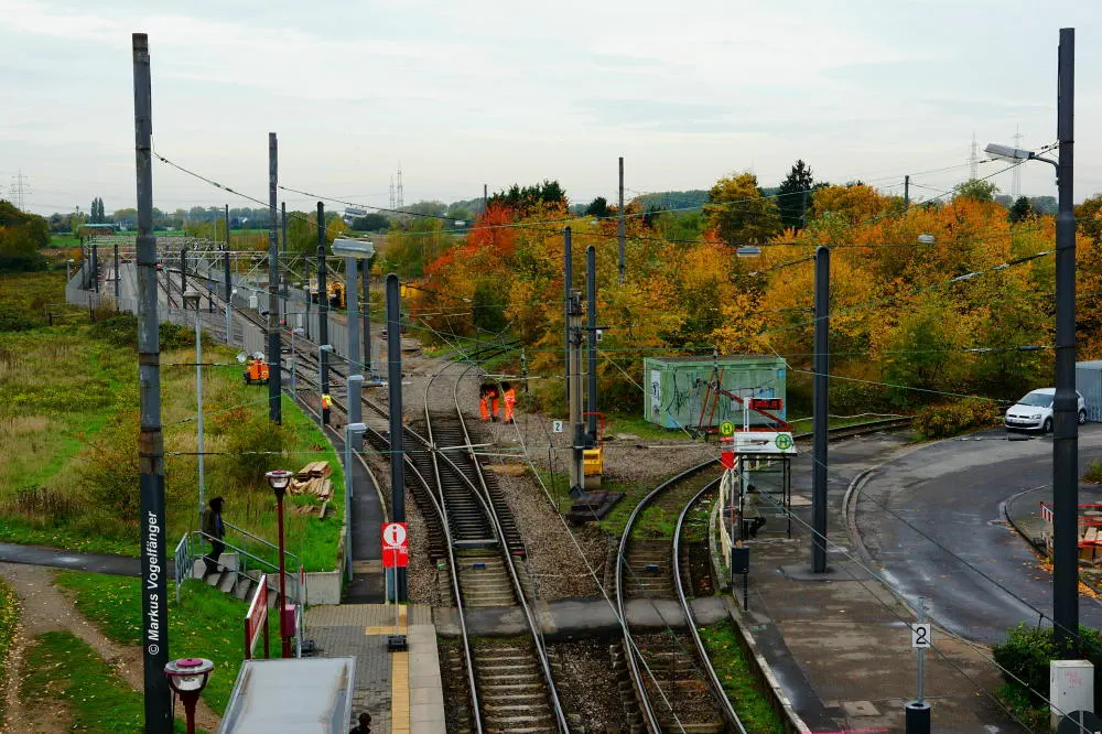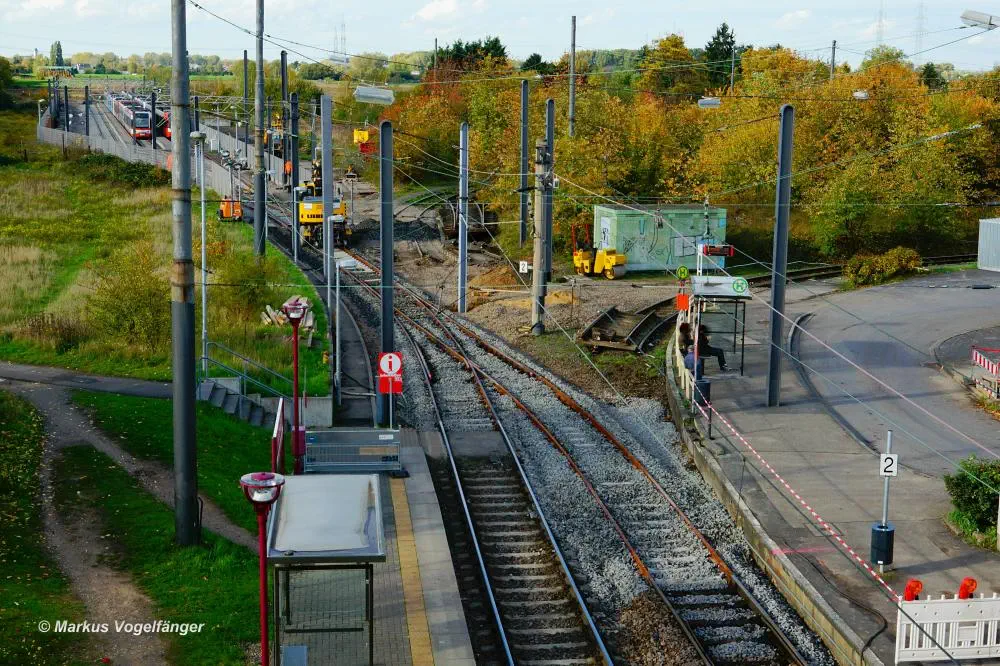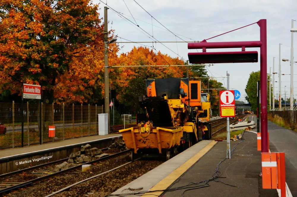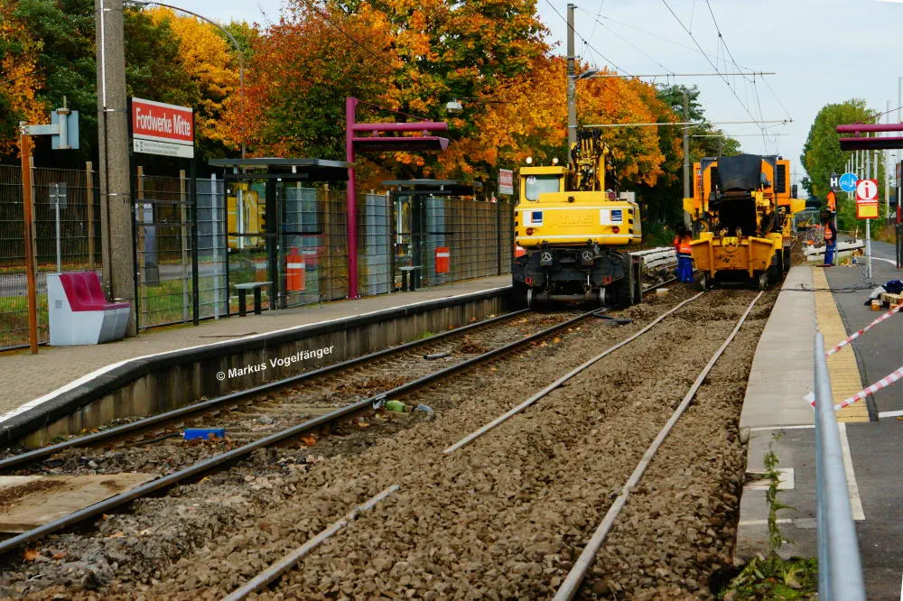 Die Haltestelle Fordwerke Mitte am 19.10.2013. Auf der rechten Seite wurde das Gleisbett bereits mit neuen Schwellen und gereinigtem Schotter versehen.