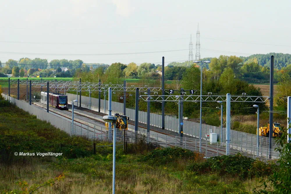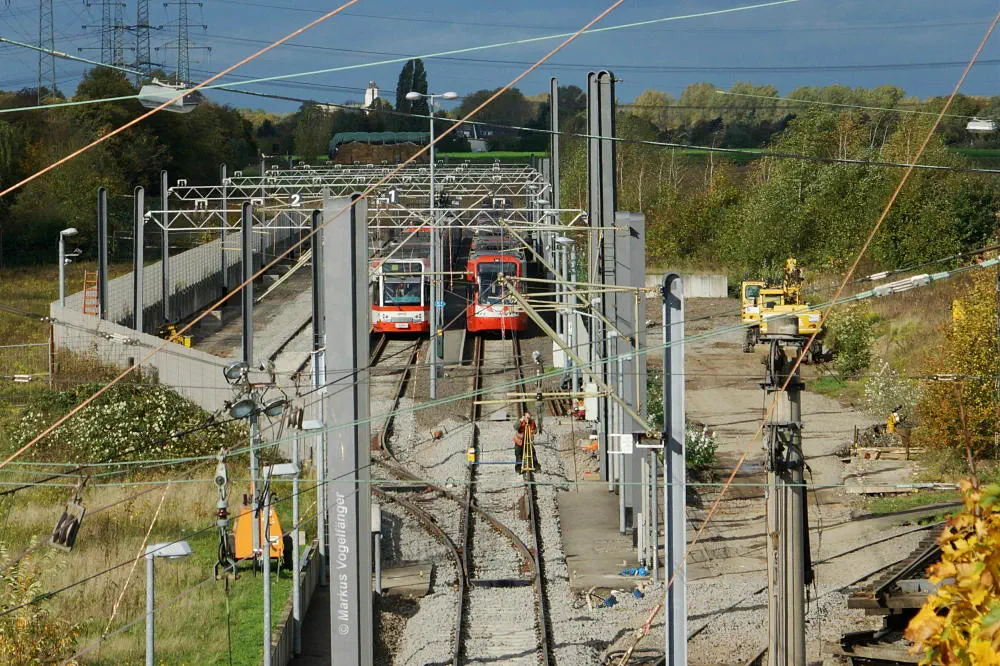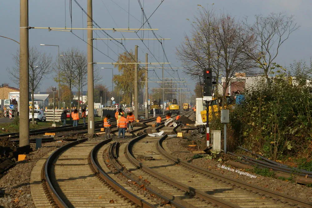 Der aktuelle Bauzustand des Streckenabschnittes zwischen den Haltestellen "Merkenich Mitte" und "Merkenich" am 09.11.2013.
