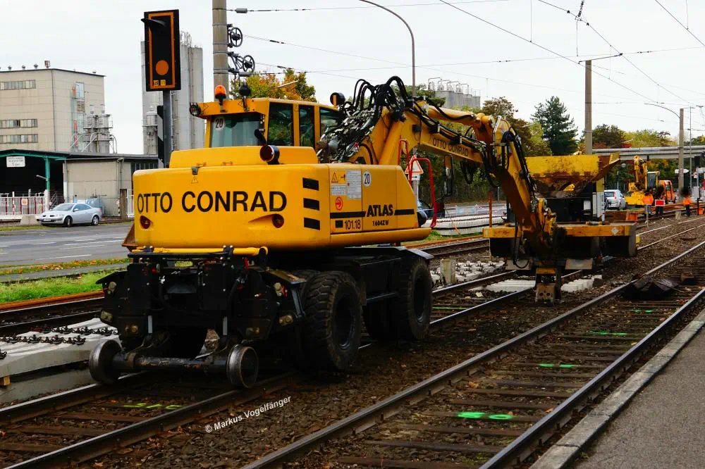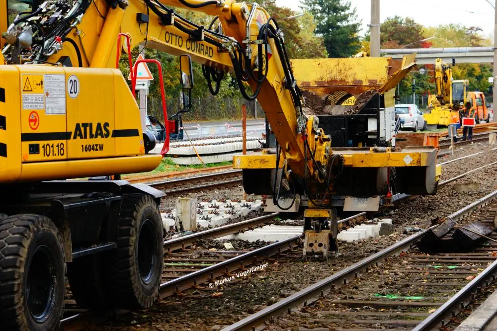 Ein Bagger transportiert die nicht mehr benötigten alten Gleise der ehemaligen Wendeschleife "Merkenich" ab.