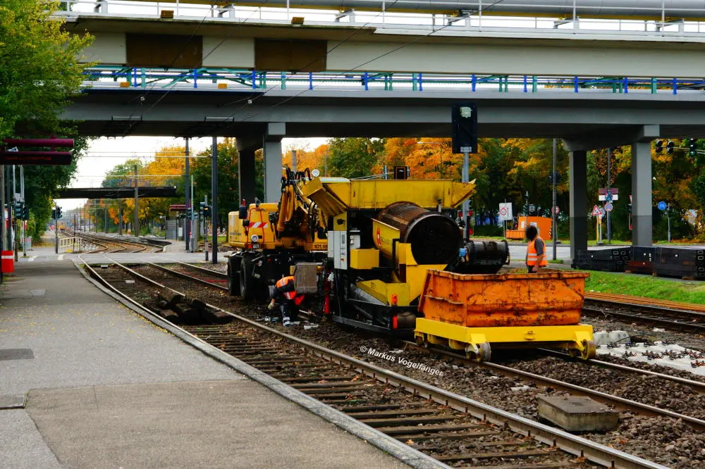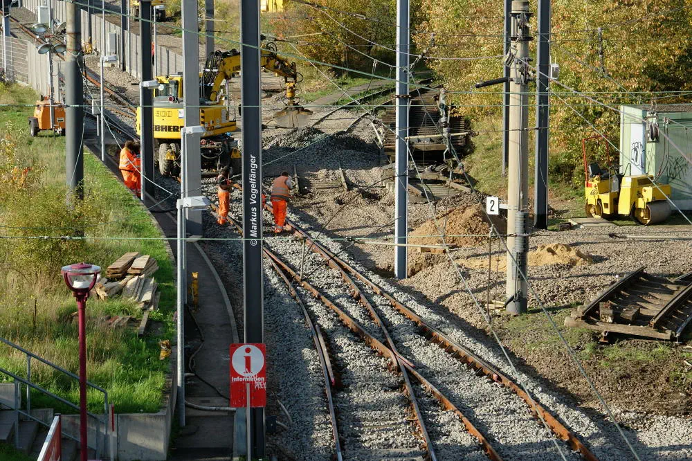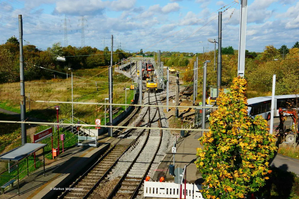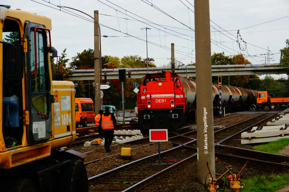 Blick von der Bremerhavener Straße auf die Emdener Straße. Auf dem linken Streckengleis wurde bereits das Gleisbett erneuert wobei der Schotter gereinigt wurde und neue Schwellen verlegt worden sind. Rechts ist das alte Gleisbett mit pinken Markierungen an den Gleisen für die neue Position der neuen Schwellen zu sehen. Nach der Fertigstellung des neuen Gleisbettes werden dann die Schienen und die Gleiskreuzungen erneuert.