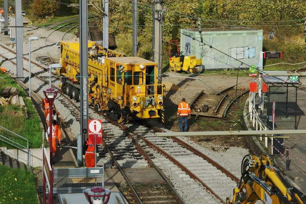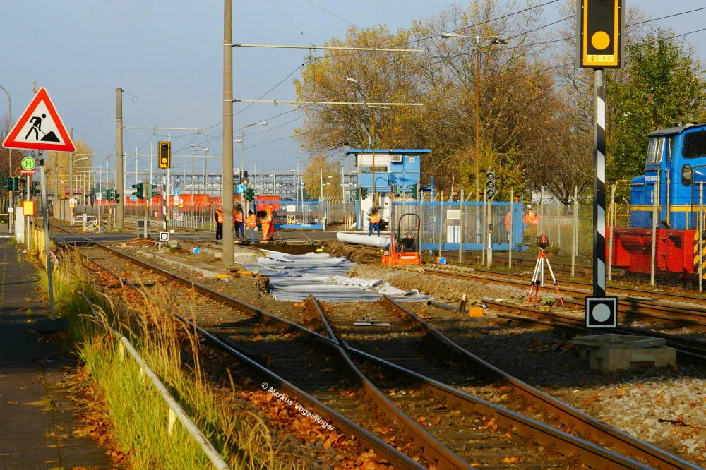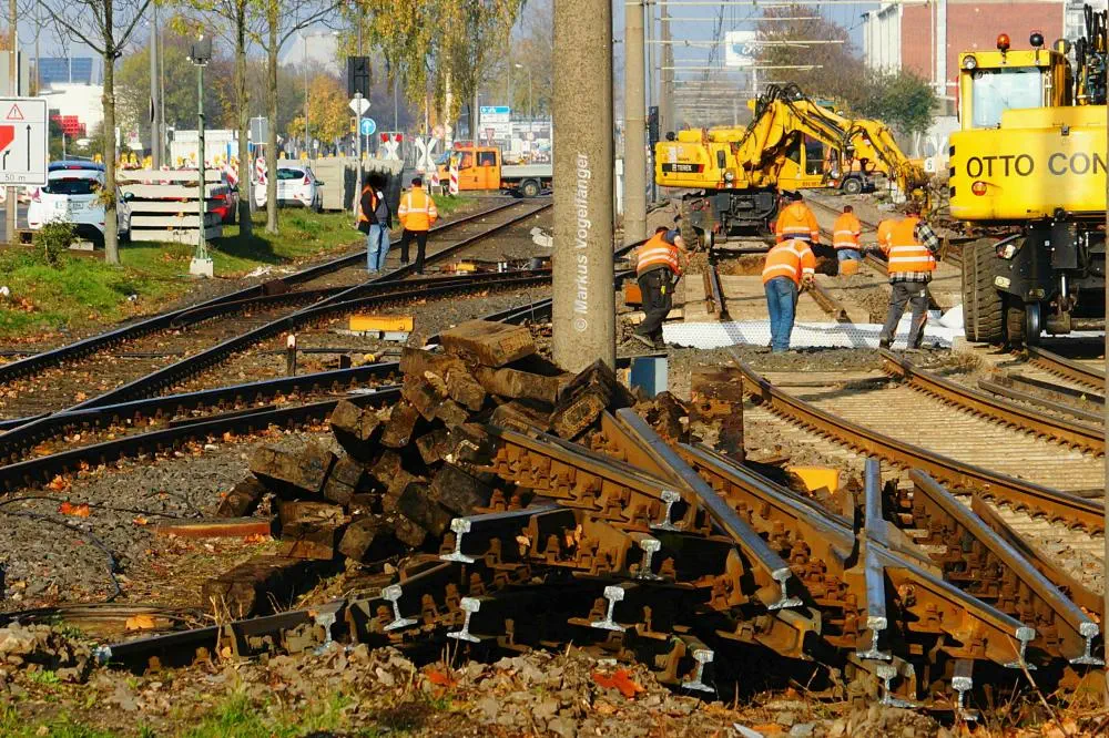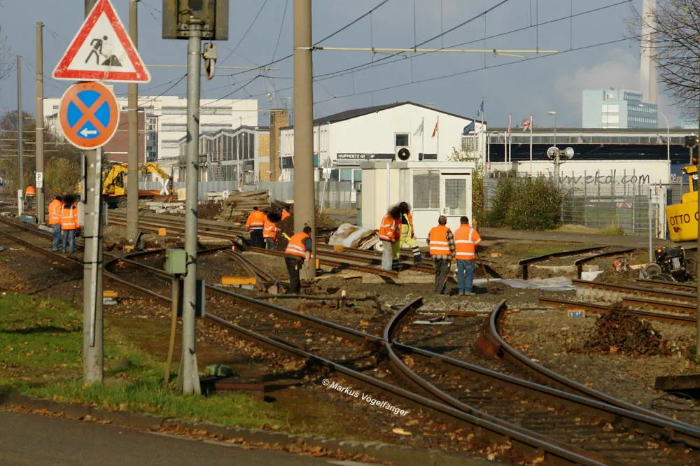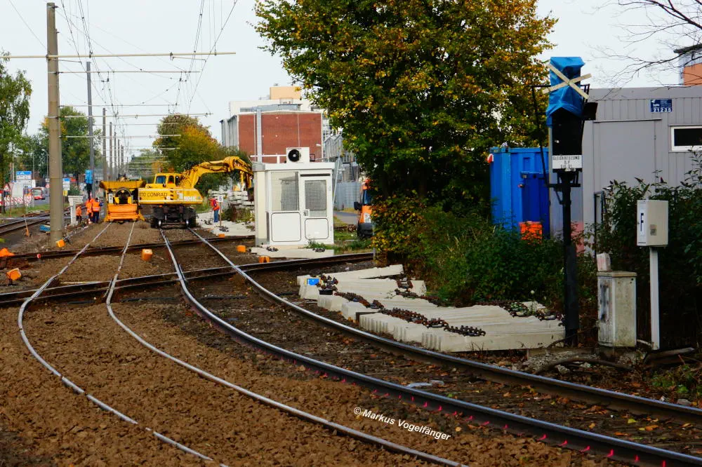 Die Haltestelle Fordwerke Nord am 19.10.2013. Die neuen Schwellen werden provisorisch am alten Gleis befestigt um das neue Gleisbett mit dem vorher gereinigten vorhandenen Schotter herzustellen.
