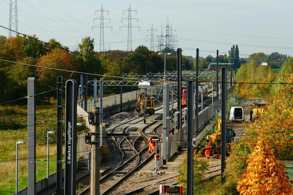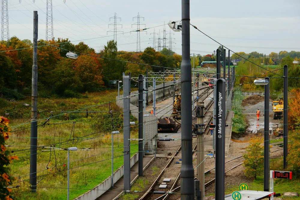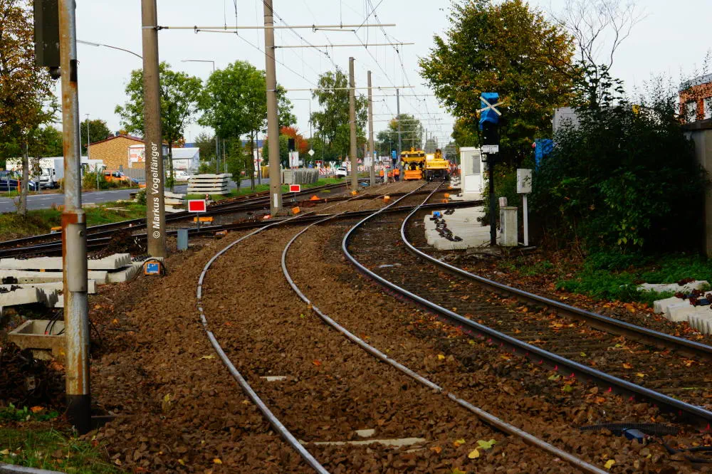 Blick von der Bremerhavener Straße auf die Emdener Straße am 20.10.2013. Das Gleisbett wurde für beide Streckengleise gereinigt und die Schwellen wurden ausgetauscht.