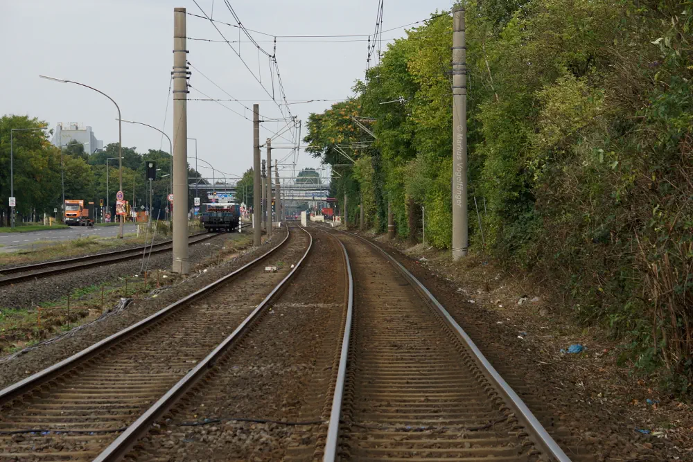 Die Streckengleise der Linie 12 zwischen den Haltestellen Merkenich und Merkenich Mitte.