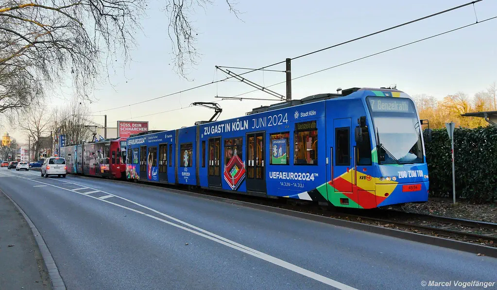4554 wurde eine neue Ganz-Gestaltung für die "Handball und Fußball-EM 2024" angebracht. Hier zu sehen auf der Kreuzung Aachener Str./Gürtel und in Benzelrath am 01.03.2023.