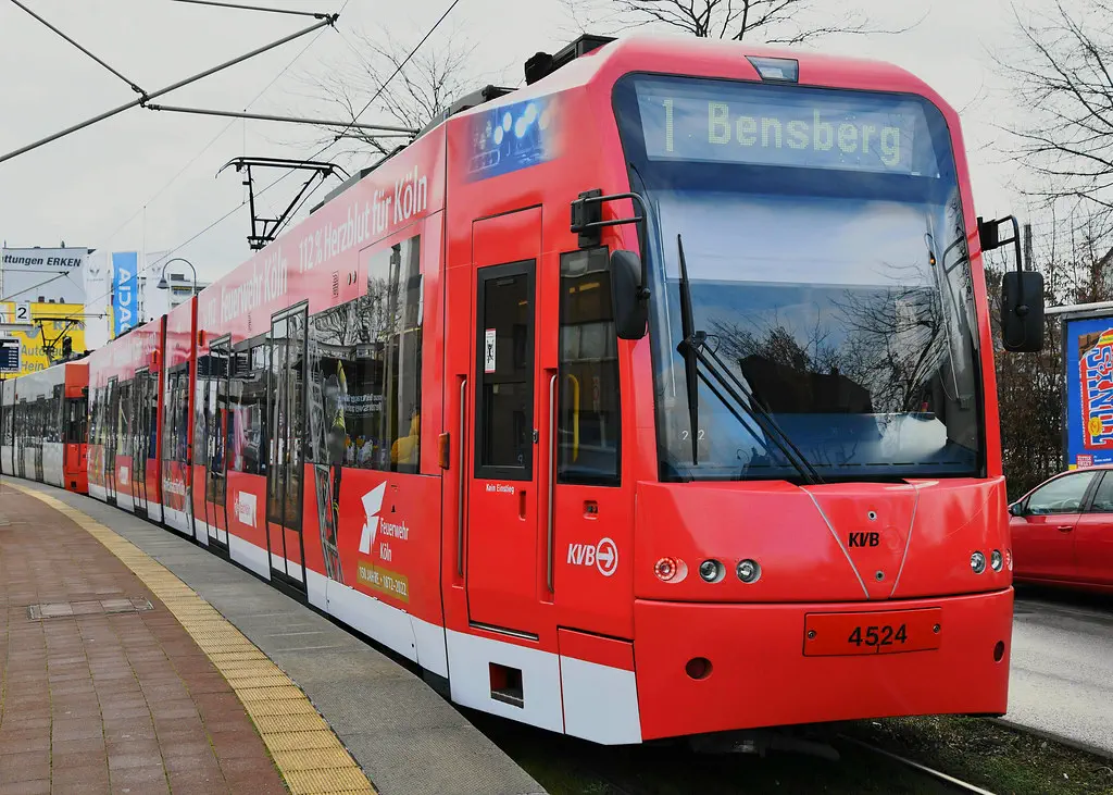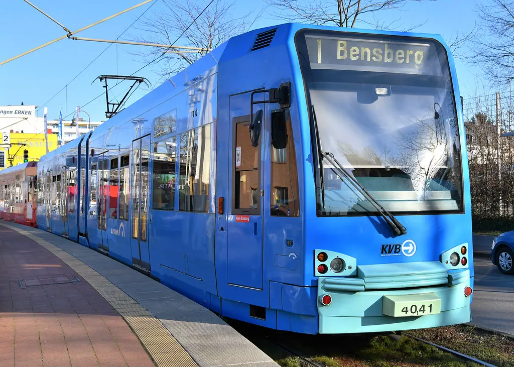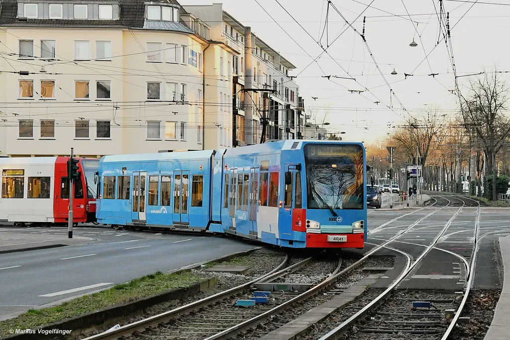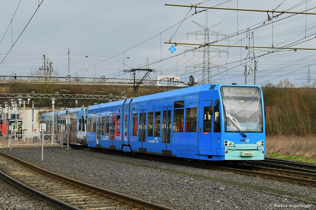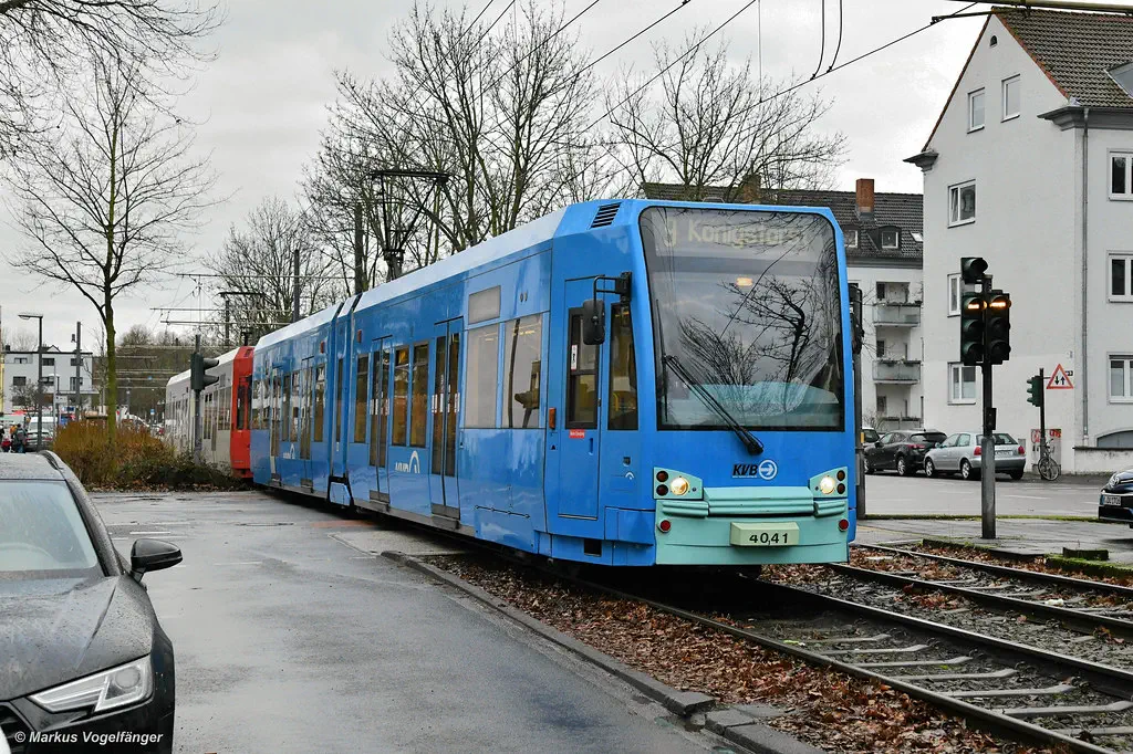 4078 wurde erneut in die aktuellen KVB-Farben lackiert. Hier zu sehen an der Muritiuskirche am 10.02.2022.