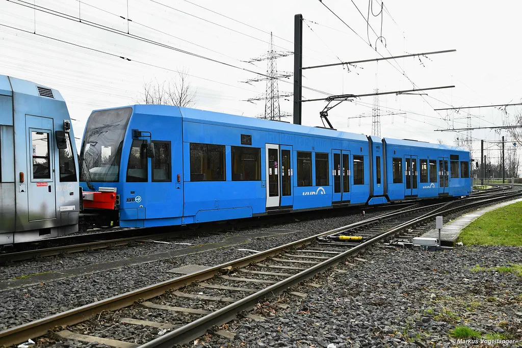 4041 wurde die KVB-Eigenwerbung "KVB-Rad" entfernt. Nun kommt die blaue Grundlackierung der ehemaligen KVB-Eigenwerbung Klimaschutz Hochwasser zum Vorschein. Hier in Sülz am 08.02.2022.