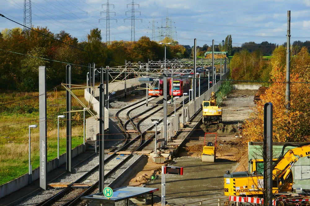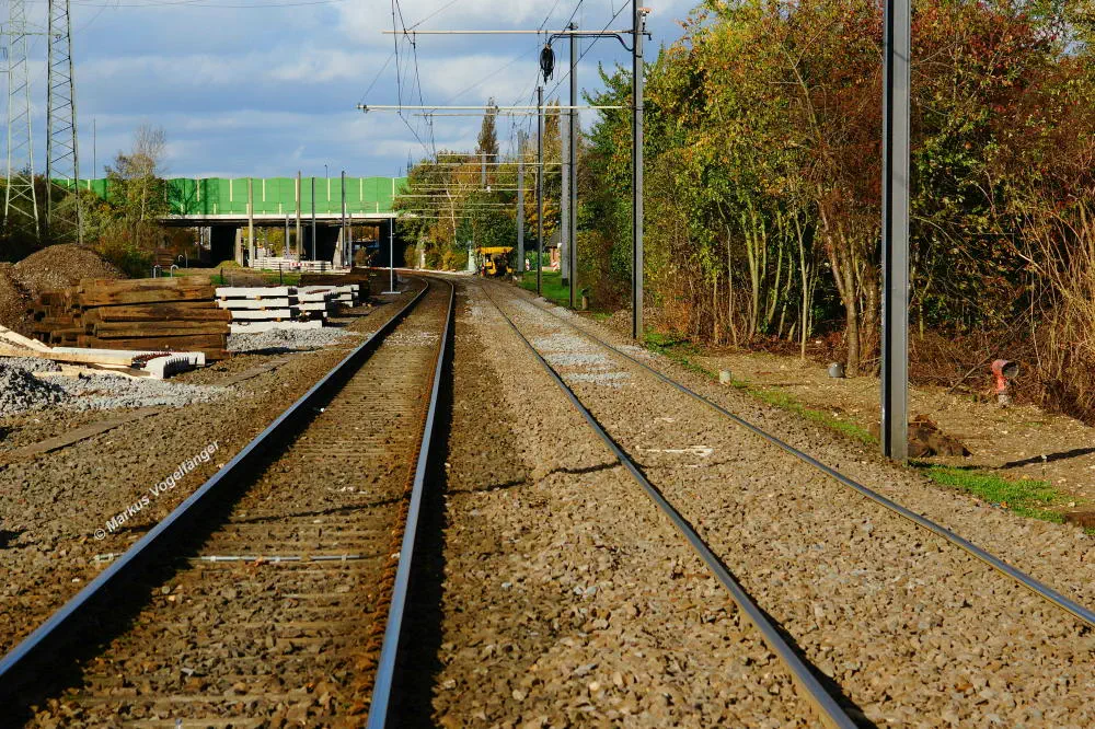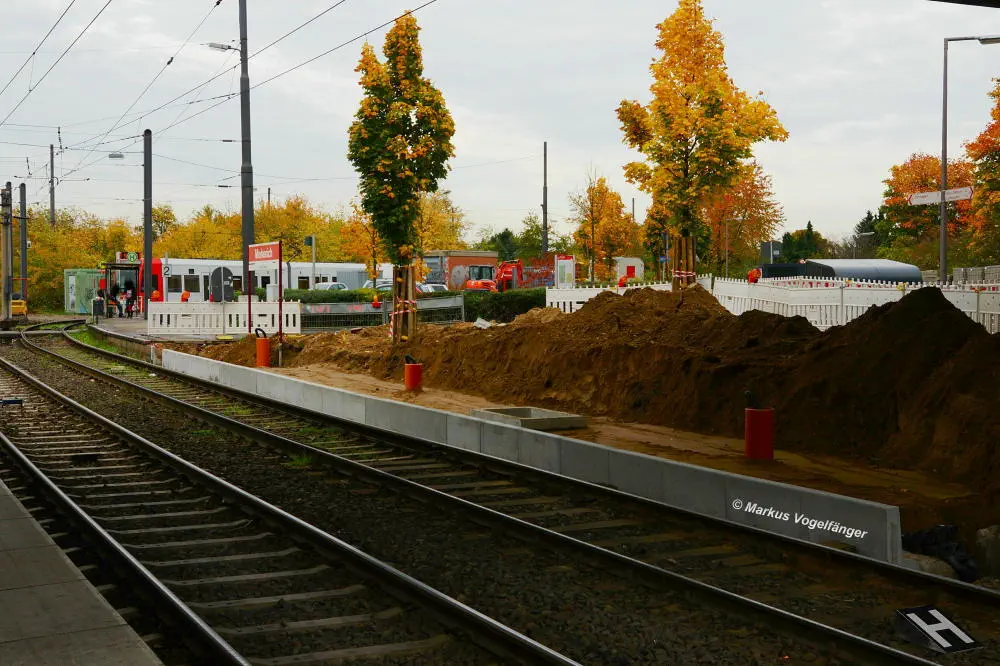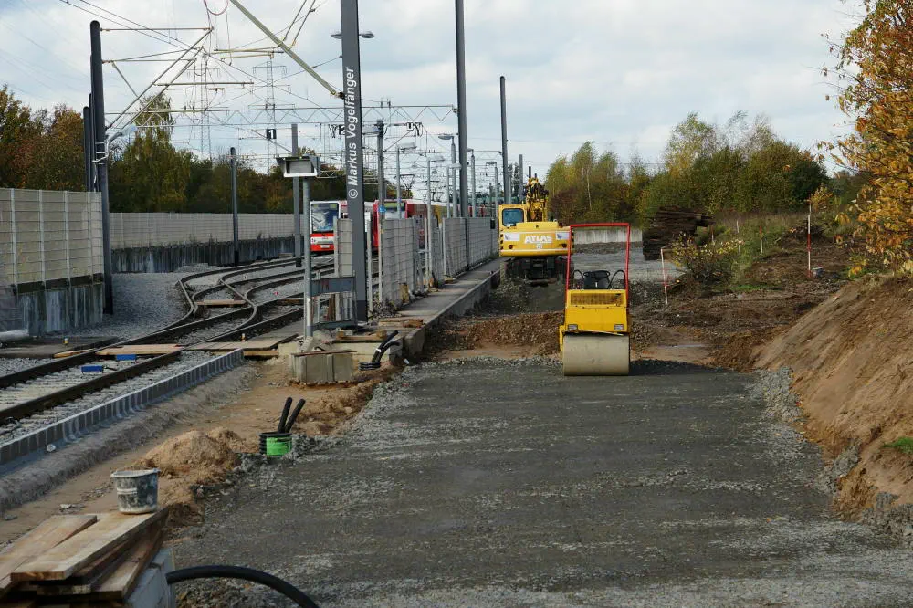 Der aktuelle Bauzustand des Streckenabschnittes zwischen den Haltestellen "Merkenich Mitte" und "Merkenich" am 09.11.2013.