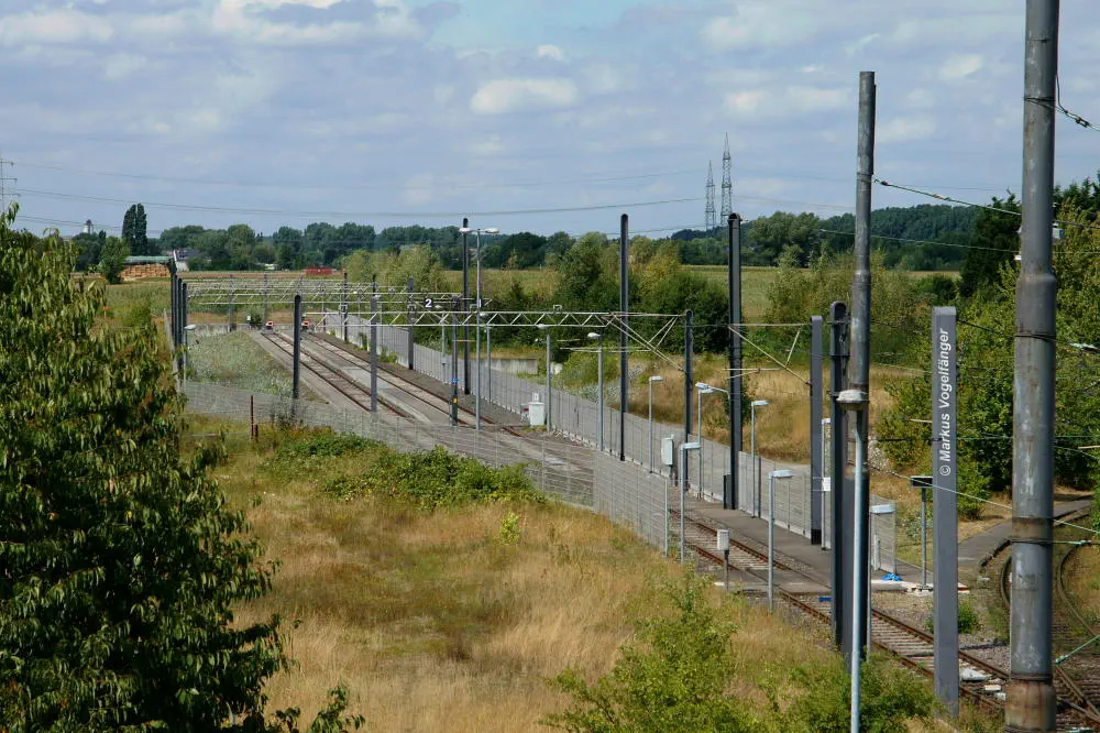 Die Streckengleise der Linie 12 zwischen den Haltestellen Merkenich und Merkenich Mitte.