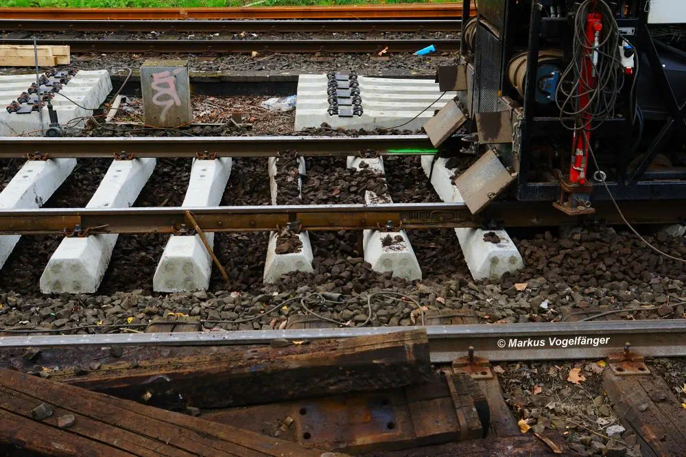 Die neuen Betonschwellen mit Gleisbefestigung am 19.10.2013.