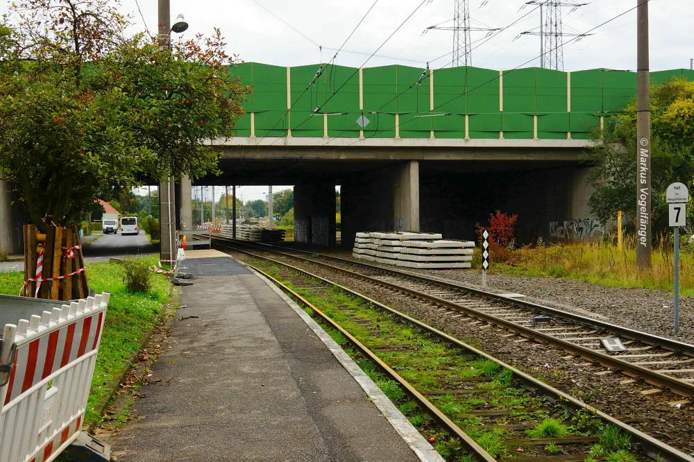 Die Ankunftsbahnsteig Merkenich (im Hintergrund) am 18.10.2013. Er wurde provisorisch um einige Meter Richtung Merkenich Mitte verlegt.