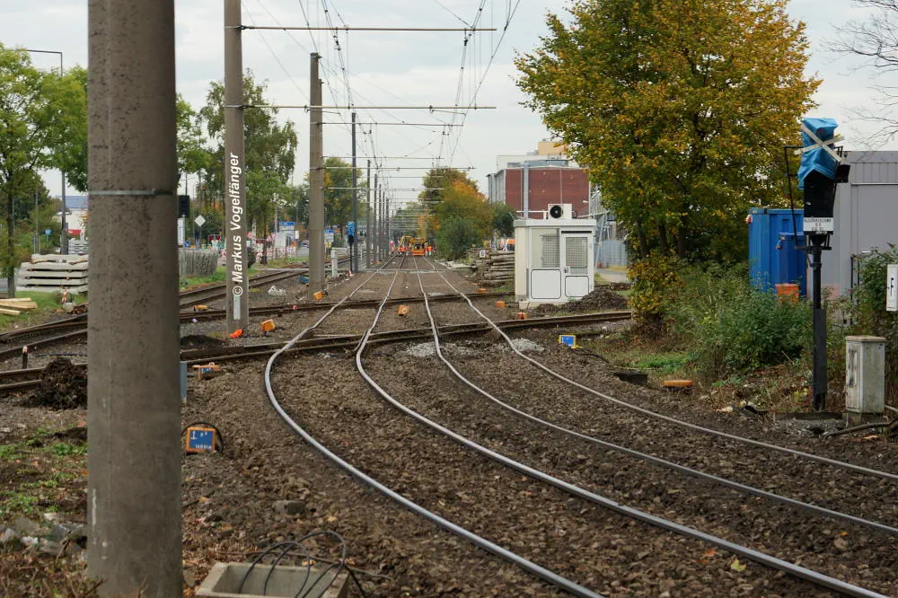 Blick von der Bremerhavener Straße auf die Emdener Straße am 20.10.2013. Das Gleisbett wurde für beide Streckengleise gereinigt und die Schwellen wurden ausgetauscht.