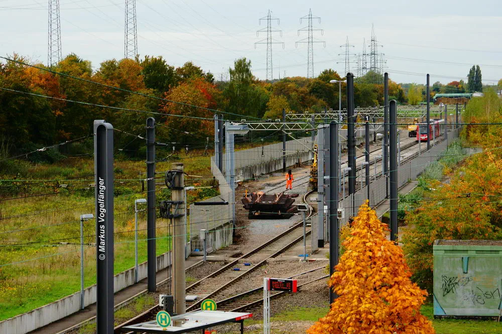 Die Haltestelle Fordwerke Mitte am 19.10.2013. Auf der rechten Seite wurde das Gleisbett bereits mit neuen Schwellen und gereinigtem Schotter versehen.