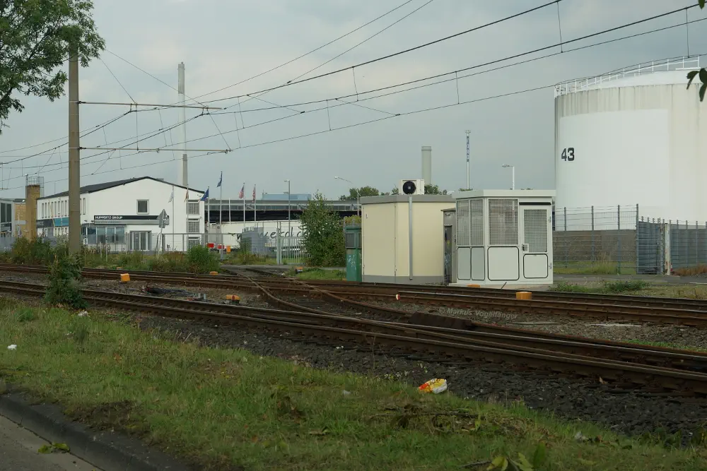 Blick von der Bremerhavener Straße auf die Emdener Straße. Links das Güterzuggleis und rechts die Streckengleise der Linie 12.