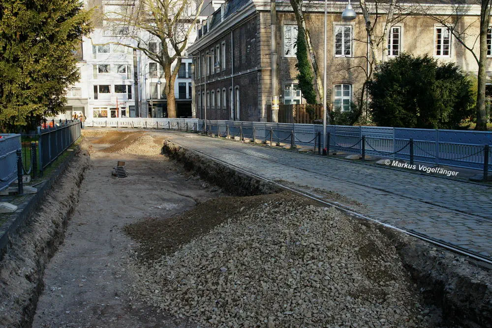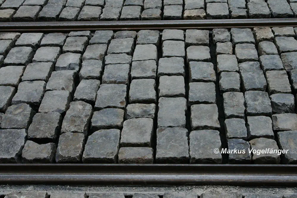 Nachdem die Gleise an der Mauritiuskirche neu verlegt worden sind und der Stadtbahnbetrieb wieder aufgenommen wurde, wird das Natursteinplaster aus Blaubasalt welches im Rahmen der Bauarbeiten entfernt wurde, nun bis Ende Mai 2013 wieder eingebaut.