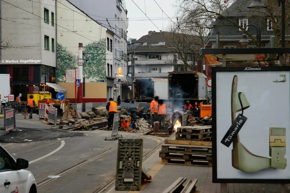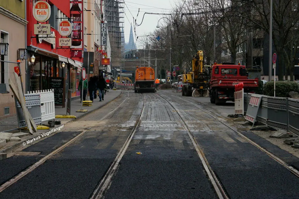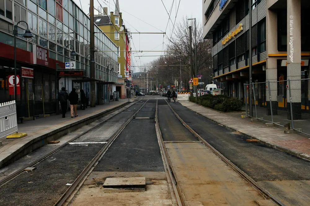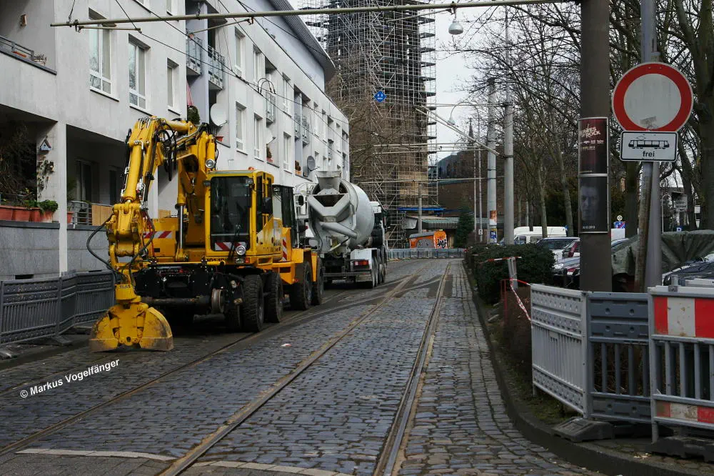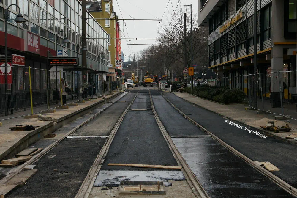 aktueller Bauzustand auf der Jahnstraße mit Blick zur Haltestelle Zülpicher Platz am 21.04.2013.
