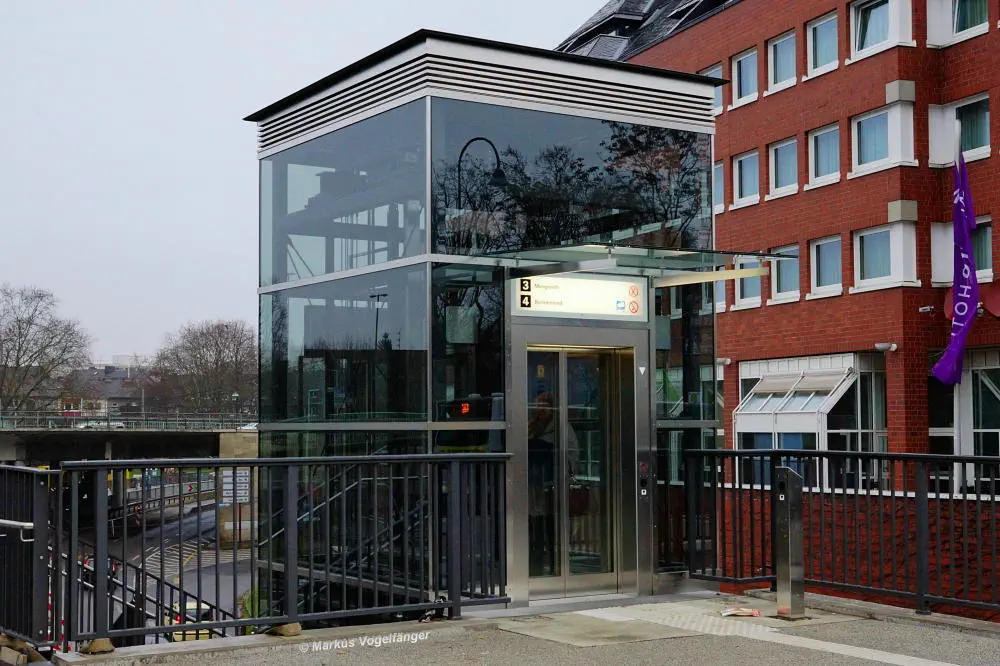 Der Aufzug zum Bahnsteig der neuen oberirdischen Haltestelle Severinstraße der Linien 3 und 4 Fahrtrichtung Suevenstraße