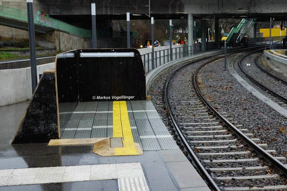 Blick auf die provisorische Bahnsteigverlängerung des Bahnsteigs Richtung Suevenstraße der oberirdischen Haltestelle